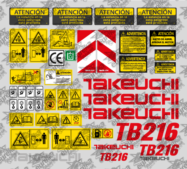 Nuestras pegatinas compatibles para maquinaria, como el modelo Takeuchi TB216, están diseñadas para soportar condiciones de trabajo exigentes y garantizar una larga vida útil.